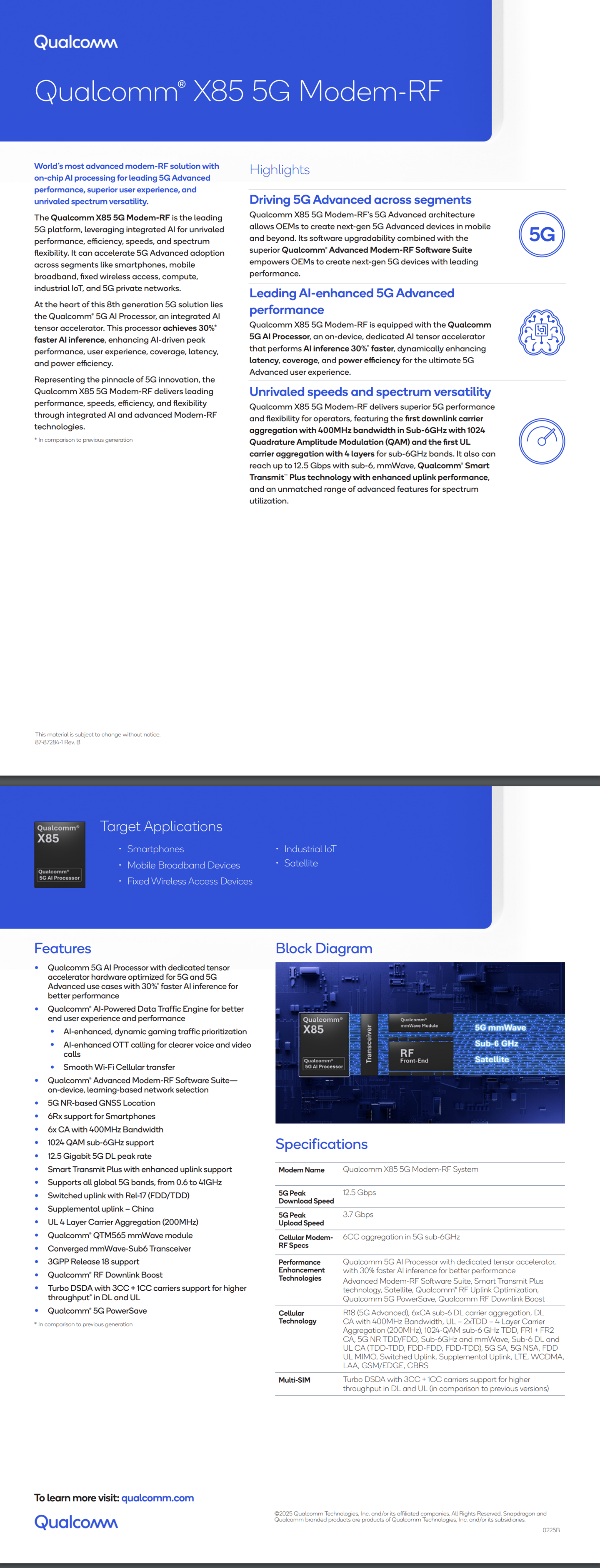 IT之家 3 月 3 日新闻,高通本日在 MWC 2025 上颁布了多款新品,包含第八代 5G 调制解调器至天线处理计划 ——Qualcomm X85 5G Modem-RF(IT之家以下简称 X85)。作为寰球首款支撑 10Gbps 5G 峰值下载速率的调制解调器及射频体系,X85 集成了第四代高通 5G AI 处置器,可供给 12.5Gbps 的下行峰值速度、3.7Gbps 下行峰值速度。高通表现,中国电信、中国挪动、中国联通、谷歌、KDDI、NTT DOCOMO、T-Mobile、Verizon 等寰球经营商已公然支撑 X85,独特推进 5G-A 商用安排。