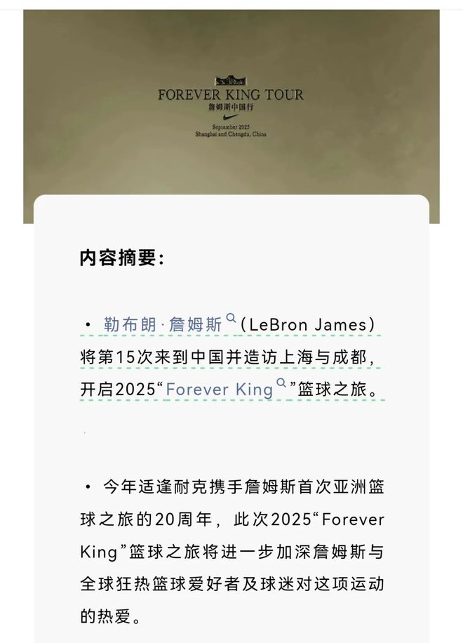 您收到通知了吗? ?詹姆斯要去上海!呢✅免费门票正在注册。彩票绘图方法。每个人都可以参加,每个人都有机会。预订策略已提前收集! James Shanghai Station Registration Reservation Entrance: ️The Official Account Card Below Respond to Keyword [China Tour] to respond to this official account ~ Source: The theme of the official account "About Nike About Nike" Event: LeBron James 2025 "Forever King" Basketball Tour Shanghai Station ⌚️ Events Time: Expected in September Announced) No On-site ticket sales ⏰️Draw Time: Open Equal at 10:00 August 25 ✅ Winning Notice: Notice SMS from August 31 to 9月2日