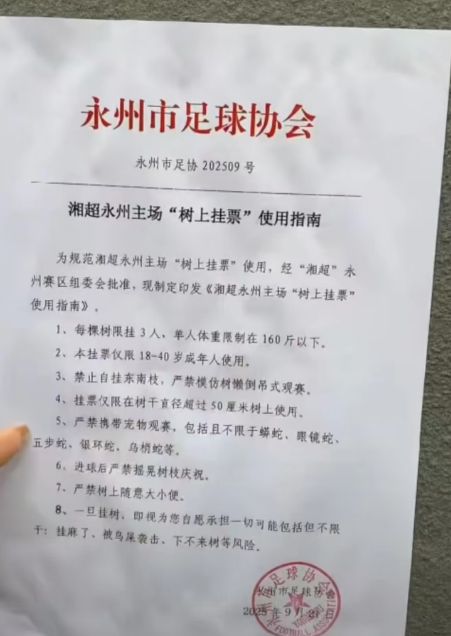 9月21日晚上,2025年的匈奴超级联赛将激发扬州和江坦之间的主场比赛。在游戏开始之前,扬州足球协会发布的“扬州超级联赛”(因此称为“指南”)中使用“门票”的“指南”(因此,从称为“指南”)引起了广泛的关注,这是由于“观看树上的游戏”的新颖形式。 21日下午,Dawan News的一名记者就此事联系了Yongzhou足球协会。相关人员回答说,发布“树票”指南是一项提案,结合了扬州集团的房屋的特征,旨在满足热情的观众的需求,并配备了维持安全和采用的相应步骤。 “树票”设置的“规则”仅适用于成人,仅适用于18-40,观众的重量受到约束,要求单人的重量不超过160千克,而每棵树条件必须仅限于3人。同样很明显,树木应满足“躯干直径超过50厘米”的硬件要求。此外,“规则”特别提醒了危险,包括但不限于:诸如鸟屎攻击的麻木之类的风险,而树也无法倒下。”据扬州足球协会的工作人员称,源自房屋体育场的“本地角色”的“树中的标题” - 树木是在体育场周围种植的,树木的高度超过1米,“正常的成年人可以上下自身上下。”工作人员说,扬州团队的房屋比赛引起了极大的关注,一些公民发现很难在网站上观看游戏,因为他们无法购买门票。 “每个人都热衷于观看游戏并且无法购买门票,因此有些观众考虑这种观看游戏的方法。这也是一件好事,所以让我们移动它。”据工作人员说:“票S到Tree“不仅在9月21日晚上为游戏服务,而且随后在匈奴超级联赛中回家的比赛将能够站起来并遵循这种外观。关于安全保证的问题,扬佐足球协会的工作人员表示,他们采取了周围的安全措施,并将在竞赛中保持竞争者的范围“确保竞争者”的命令,以确保“确保竞争者”的范围“保持开发项目”。注意到,杨祖以前的谣言会在家中“蛇”。