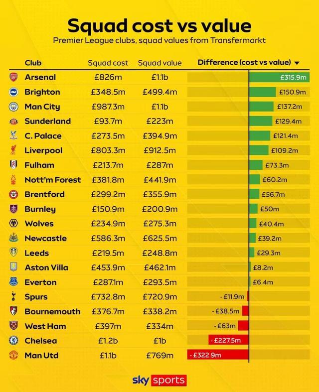 8月27日,北京时间,天空体育宣布了基于德国运输数据的各种英超俱乐部的“线性成本与阵容价值”列表。该列表显示,阿森纳是英超联赛中最有效的球队,而曼联则处于最低水平。数据显示,阿森纳花了8.26亿英镑的价格生产阵容,目前净资产约为11亿英镑,增加了3.16亿英镑,在整个英超联赛中领先。布莱顿和曼城分别排名第二和第三,分别增加了1.509亿英镑和1.372亿英镑。桑德兰,水晶宫,利物浦和其他团队也获得了超过1亿磅的“欣赏”。相比之下,投资近11亿英镑的曼联阵容的市场价值为7.69亿英镑,下降了3.229亿英镑,在最后一个英超联赛中排名。切尔西的阵容,费用约为1.2十亿英镑,现在耗资近10亿磅,下降了22750万磅。英超联赛列表列表清单(单位:磅:磅)阿森纳 +布莱顿 +曼城 + 1.509亿 +曼城 + 1.372亿 + 1.372亿桑德兰 +水晶宫 + 1.214亿利物浦 + 1.092亿 + 1.093亿富勒姆 + 733万诺丁汉森林 + 6020万诺丁汉森林 + 6020万布伦特福德 + 56.7亿burnley + 56.20.2亿Burnley + 60.200亿BURTLEY + 55.56 + 56 + 56.77.77.77.777.77.77.77.77.77.77。